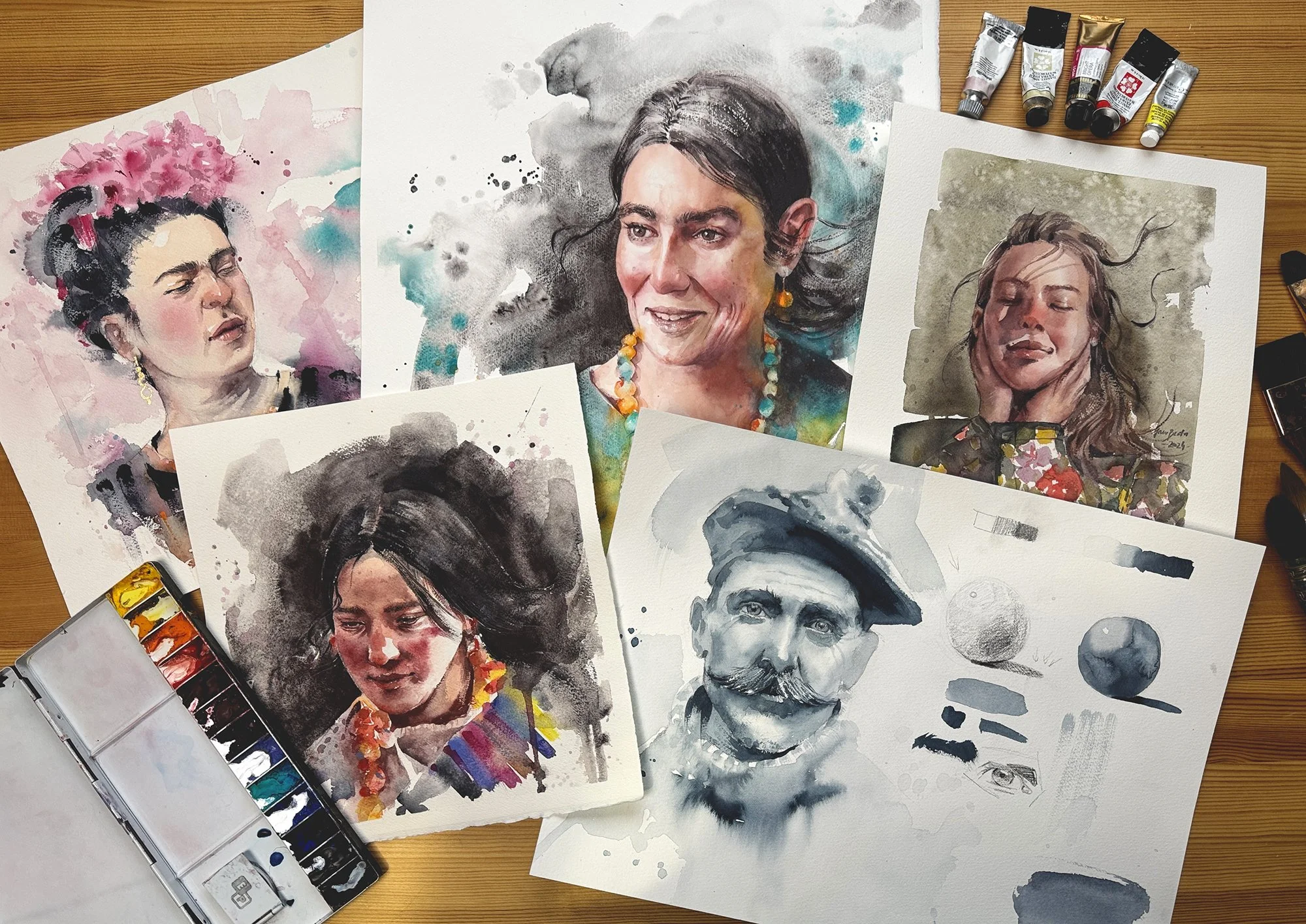 Na tomto workshope sa venujeme kresbe a maľbe portrétu akvarelovou technikou. Odporúčame, aby ste pred týmto workshopom absolvovali workshop Základy akvarelu, ale nie je to nevyhnutné, ak vás téma portrétov láka, začať môžete aj tu.